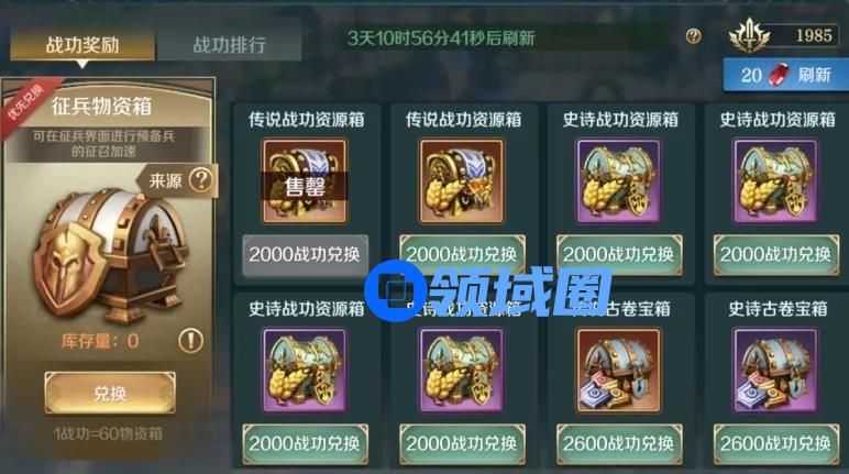 获取的战功可以在战功奖励中换取征兵包、资源宝箱和古卷宝箱。每周通过宝石刷新,一共可以换取两轮的宝箱。
