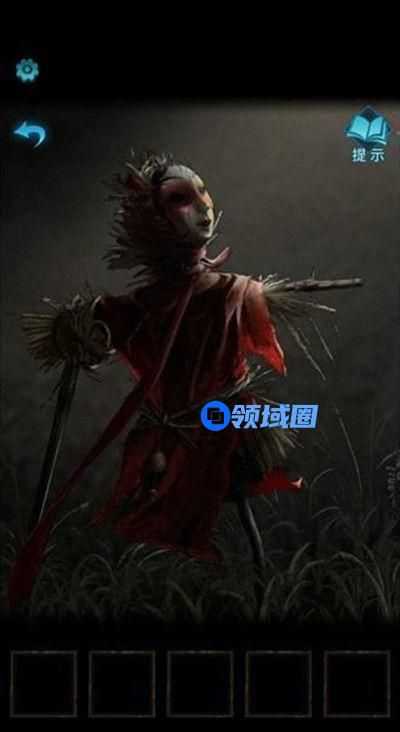 9、进入大门后看到稻草人 稻草人身上得到红丝帯 再点击右下角用刀把红丝带切成三份