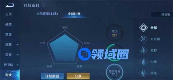 在个人主页页面点击右边的游戏选项栏,点击进入后可以看到这里有当前赛季和全部比赛的选项,我们点击全部比赛,然后就可以看到里面的综合得分,这个综合得分就是我们要查询的隐藏分,查询方法特别的简单。
