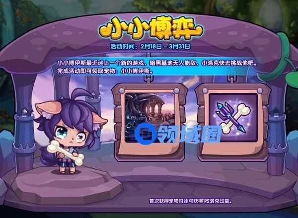 小小博伊斯最近迷上一个新的游戏,暗黑基地无人能敌,小洛克快去挑战他吧。完成活动即可领取宠物:小小博伊斯!