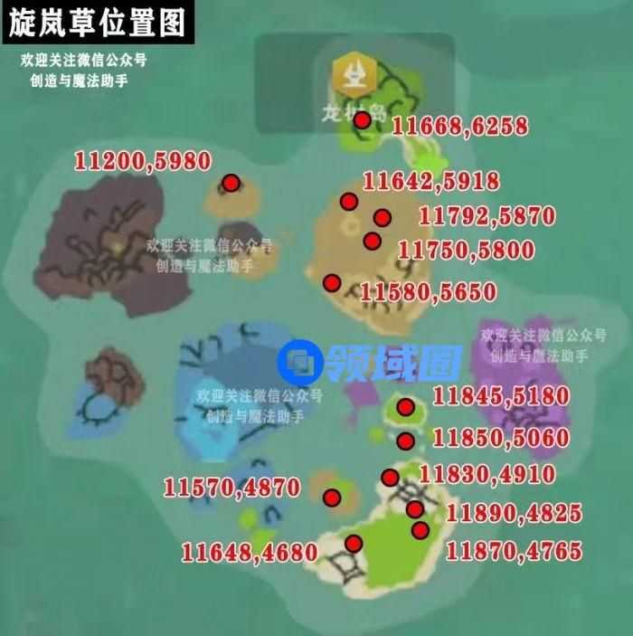 具体位置:下图是总体分布图,分布在天空岛里面的龙树岛附近,周围有很多旋岚草的刷新点。