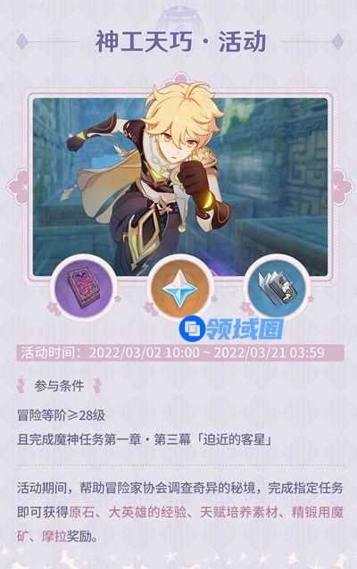 活动期间,帮助冒险家协会调查奇异的秘境,完成指定任务即可获得原石、大英雄的经验、天赋培养素材、精锻用魔矿、摩拉等奖励。