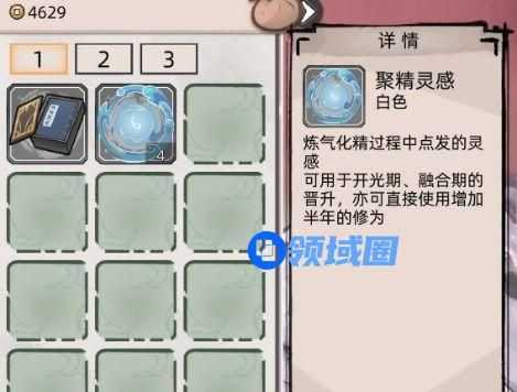 炼气化精过程中点发的灵感,可用于开光期、融合期的晋升,亦可直接使用增加半年的修为。