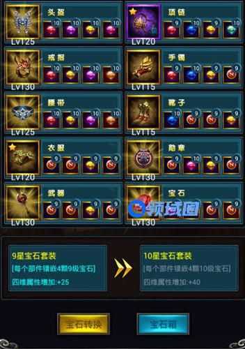 主角10个装备栏,每个装备栏最多可以镶嵌4颗不同种类的宝石,战力飙升不再难!