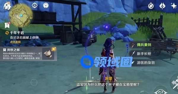 如果你先接取了世界任务【千年千岩】,找到六个供物,那直接去地点处是不会有共饮之杯的。需要在接取【巧瞒七星解磐键】任务后,有了击破磐键的方法,再去任务地点才会刷新盗宝团怪物,不解开击破磐键的方法怪物是不会刷新的,重新上线也没有用。在击破第一个磐键,也就是NPC志琼旁边的第一个磐键后才会刷新盗宝团,击破任务地点的盗宝团后,触发【潜身敌营无人知】任务后才会获取共饮之杯物品