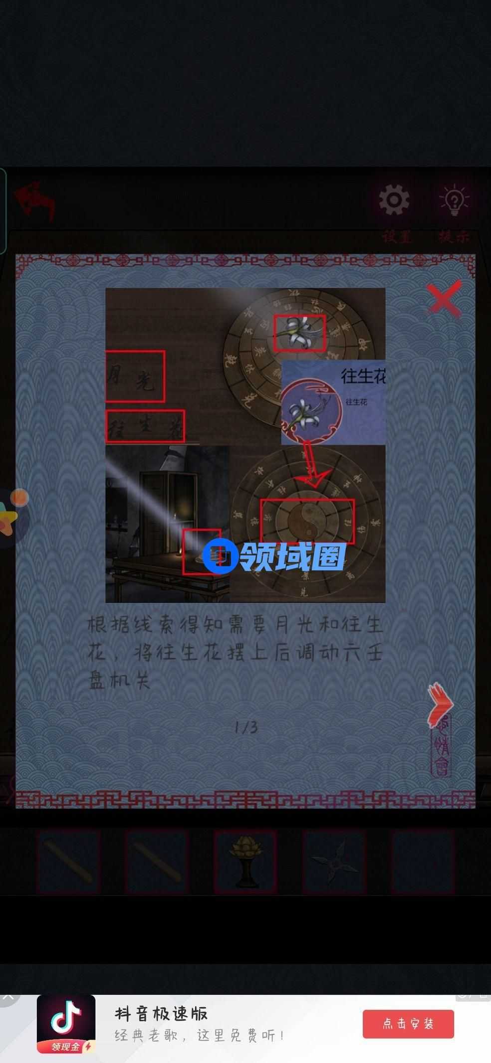 这时你会看见三个小鬼后面出现一个莲花,拿起后放入棋盘上的基座里,点击莲花以后可以拿到种子,这时不慌着进去,用飞镖把葫芦打下来,