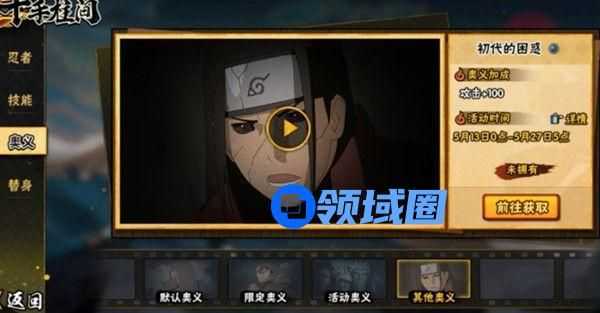 活动内容:学员可通过主界面“千手柱间”入口进入主题活动,浏览千手柱间[秽土转生]忍者故事、技能和奥义图等信息,完成送奥义活动任务可获得奥义图“火影的传承”。