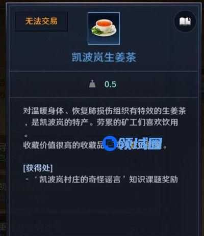 根据游戏内的文本,这个应该是完成知识收集进度100%之后给予的奖励,但是有玩家知识达到100%之后依然没有找到这个凯波岚生姜茶怎么获得。