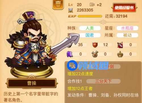 优点:在不用任何援助的情况下提高可观的速度属性,在援助英雄位置有多余的情况下,还能提供额外的王者属性。(真的是一代枭雄啊!!)
