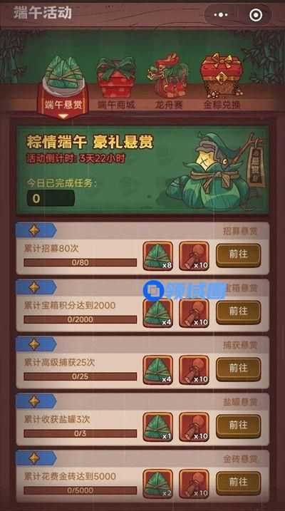 - 悬赏任务有丰厚的奖励,包括美味的粽子和鼓槌,粽子可以在背包中使用,获得招募令、黄金鱼竿等珍贵资源,更有概率获得黄金粽子,