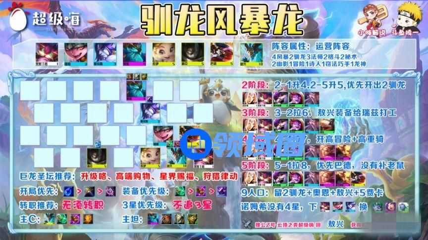 阵容解析:驯龙风暴龙,这套阵容也可以称之为风暴九五。阵容核心在于有没有2星敖兴,是能否吃分的关键。2星敖兴基本锁头秒全场,本赛季天花板阵容之一。