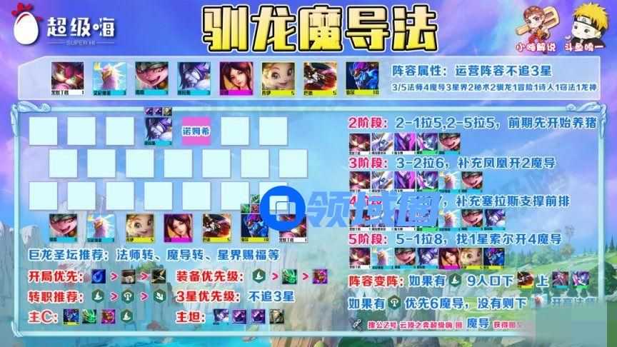 这套阵容难点就是在过渡上面,开局如果有驯龙最佳,驯龙来得越早过渡就越舒服。前期可以把敖兴的装备给瑞兹打工。如果胡娜美,可以选择直接拿法师娜美过渡。
