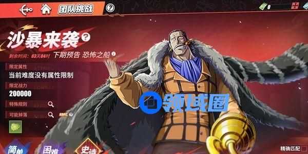 关卡难度分为简单、困难、史诗难度,且存在船长等级、战力限制,若船长等级低于关卡条件,或预设伙伴战力低于关卡条件,均无法组队或进入战斗。团队挑战玩法开启首周副本主题为「沙暴来袭」,次周为全新副本「恐怖之船」,且后续每周进行轮换。