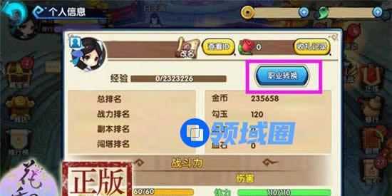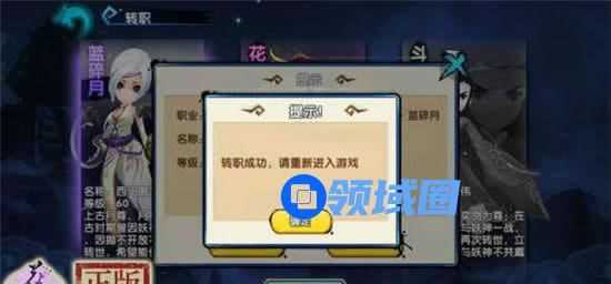 在个人信息界面点击“职业转换“按键,进入转职操作界面,选中你想转职的职业,成功转职过后,会使两个角色的相关装备、等级等所有数据信息互换。假如你的账号中有一个90级的剑尊与一个50级的花千骨,你想将90级的剑尊转职为花千骨,那么,只能将90级的剑尊与50级的花千骨这两个角色相关所有数据信息互换。