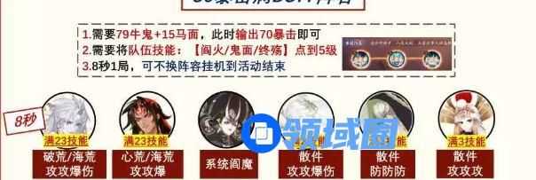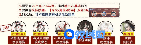注:另外有一套铃茨樱灯座7秒阵容,队伍技能:针女/鬼面/终殇点到5级;但是需要卡铃彦姬面板,有需要的小伙伴可查看微小神迹大佬的动态