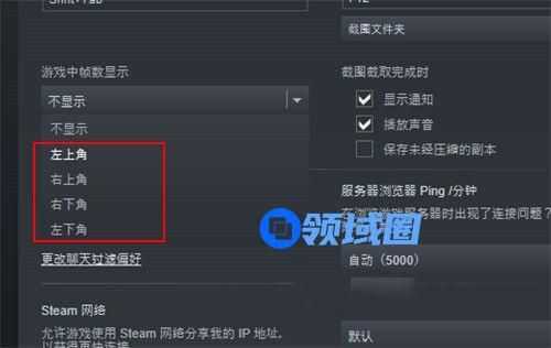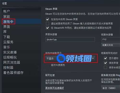3、这个时候可以找到并且点击屏幕左边的【游戏中】,可以看到有个游戏中帧数显示,然后默认是不显示的,可以点击在左右上角和下角中显示。