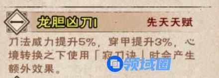 刀法威力提升5%,穿甲提升3%,心境转换之下使用【寂刀诀】时会产生额外效果(缘难断:此人心境与寂刀决相合,降低自身防御-8%的同时提升攻击力6%,最多叠加5层,即-40%防御,+30%攻击)