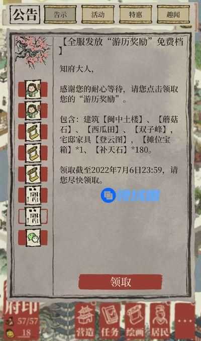 玩家们上线之后就可以看到这个公告并且点击领取了,领取之后自动获得闽中土楼等奖励建筑。