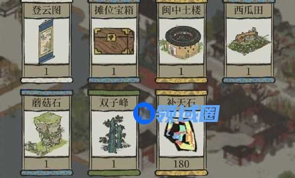 包含:建筑【闽中土楼】、【蘑菇石】、【西瓜田】、【双子峰】、宅邸家具【登云图】,【摊位宝箱】*1、 【补天石】*180。