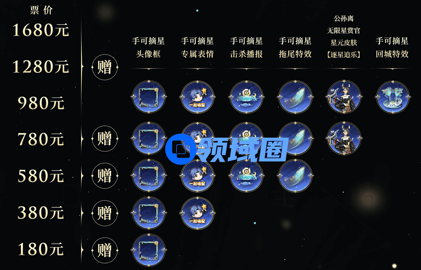 购买音乐剧门票将会随票赠送手可摘星回城特效、拖尾特效、荣耀播报、专属表情及头像框等道具,不同票价对应的赠送道具也有所不同,大家可以灵活选择。
