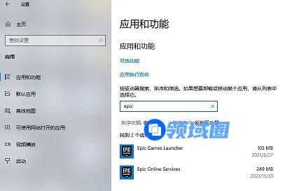 2、打开 Windows设置 – 应用 – 搜索epic,卸载 Epic Games Launcher 和 Epic Online Services,然后在epic官网重新下载,重新安 装epic的客户端,安 装后用steam账号登录。