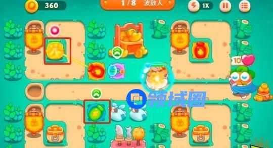 3.第三步在下排设置新炮塔,兔子快清完时让炮塔清理其他道具。