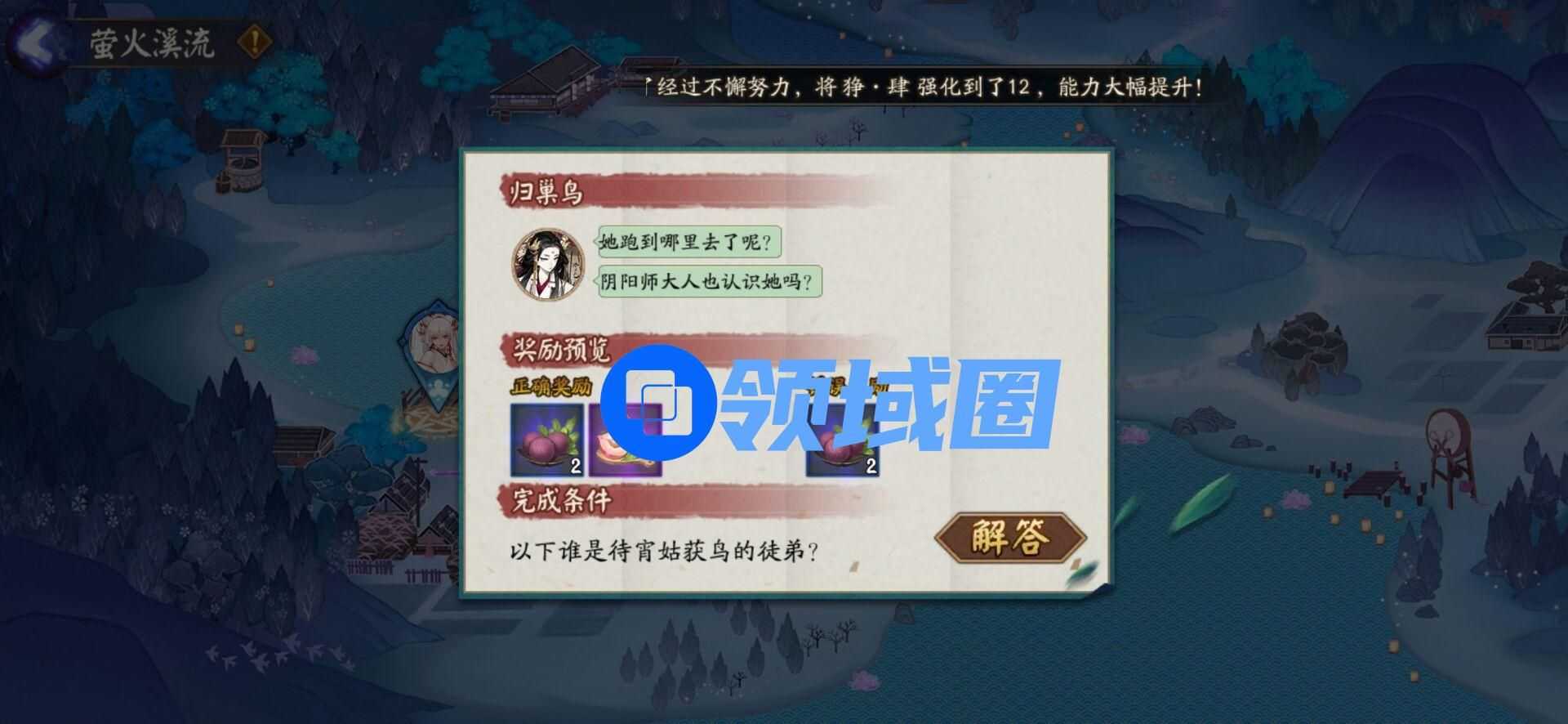 阴阳师萤火溪流第七天的问题是:以下谁是待宵姑获鸟的徒弟?