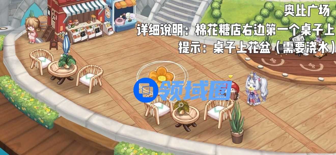 <1>:奥比广场-棉花糖店右边第一个桌子上(桌子上花盆-需要浇水)
