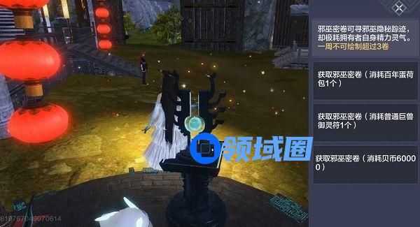 1.主城巫咸使者身旁的巫祭台周末开放兑换,旅者每周可兑换三本【邪巫密卷】。旅者根据自己的情况,在百年蛋荷包、百年御灵符、60000贝币任意一种即可兑换。