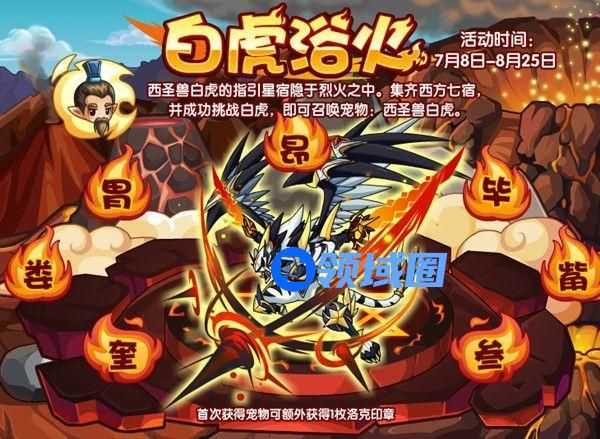 西圣兽白虎的指引星宿隐于烈火之中。集齐西方七宿,并成功挑战白虎,即可召唤宠物:西圣兽白虎。