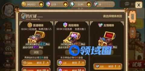 小编提示,玩家每天在铁匠铺中都会拥有数次免费的“金币/水晶”精铸机哦,虽然每次操作之间都有一定的时间间隔,但是请相信小编,每次冷却时间完成之后回来执行精铸操作是十分必要的,有时候还能够获得意外的惊喜哦!同时,在进行装备强化操作之前,也可以先查看铁匠铺等级是否能够提升,如果提升完建筑等级之后再执行相关的操作,能节省一大笔材料!