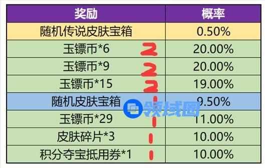 3、活动抽奖概率:随机传说皮肤宝箱0.5%、随机皮肤宝箱 9.5%、玉镖币*6 20%、玉镖币*9 20%、玉镖币*15 19%、玉镖币*29 11%、皮肤碎片*3 10%、积分夺宝抵扣券*1 10%。