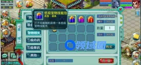 玩家可使用元宝购买低级宠物技能包、中级宠物技能包、高级宠物技能包。