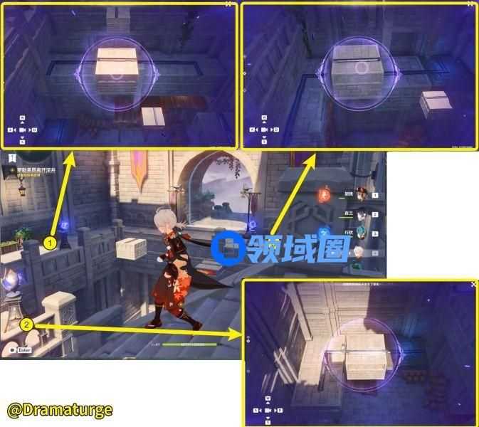 【①】两座桥上各有一个普通的宝箱(宝箱1,宝箱2),需要修复桥后上去。