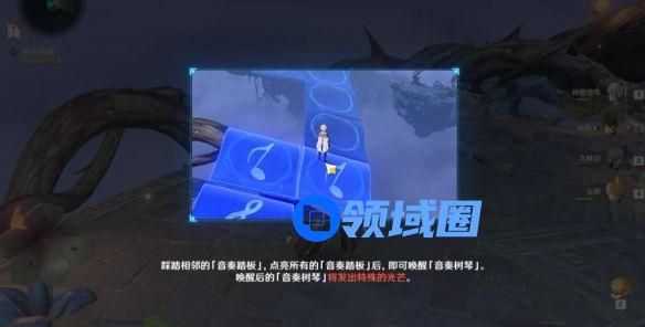 14、接着在前往阻挡水脉石头位置,会发现周边有树琴与喇叭。这里的石头需要利用竖琴音符来破坏。