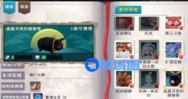 刷新出遥望月亮的猪猪怪后,喂它吃15个青涌土花即可捕捉成坐骑。