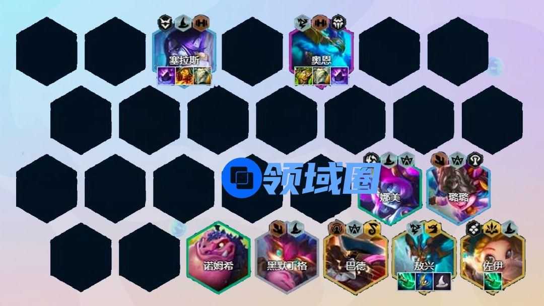 阵容组成:塞拉斯、奥恩、娜美、露露、黑默丁格、巴德、敖兴(法师纹章)、佐伊