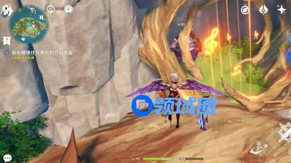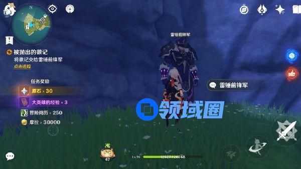 (7)激活风元素机关,飞上来之后,我们在山里面的夹层看到一个雷锤,然后我们过去进行对话,最后玩一次,再进行对话,把徽记交给他。