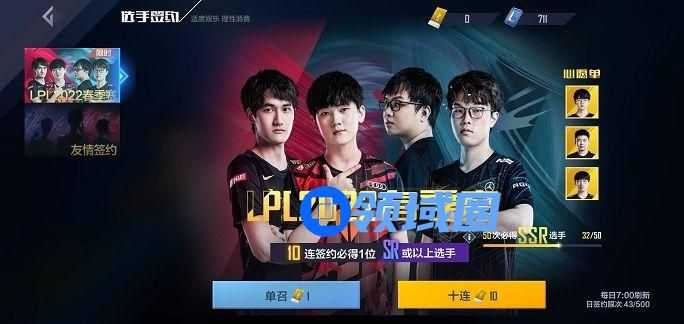 在游戏的主页面会有一个签约的板块,点进去你就会发现,在这里大家可以随机抽取LPL数据库中的选手,前提是你需要有足够金色签约券或者友情点。签约的方式总共有两种:一种为金色签约券抽取,可以单抽,也可以10连抽,10连抽必定会得到一位SR或以上的选手,而合计抽取达50次则必得SSR选手。
