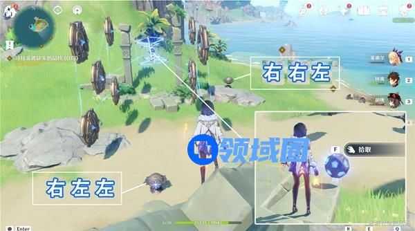 需要开船过去,这里有两个旋转机关,近处的机关旋转,按顺序右左左3次。远处的机关旋转,按顺序左左右3次(完成后机关无法调整的),破解后,晶核掉落地上,即可拿到。