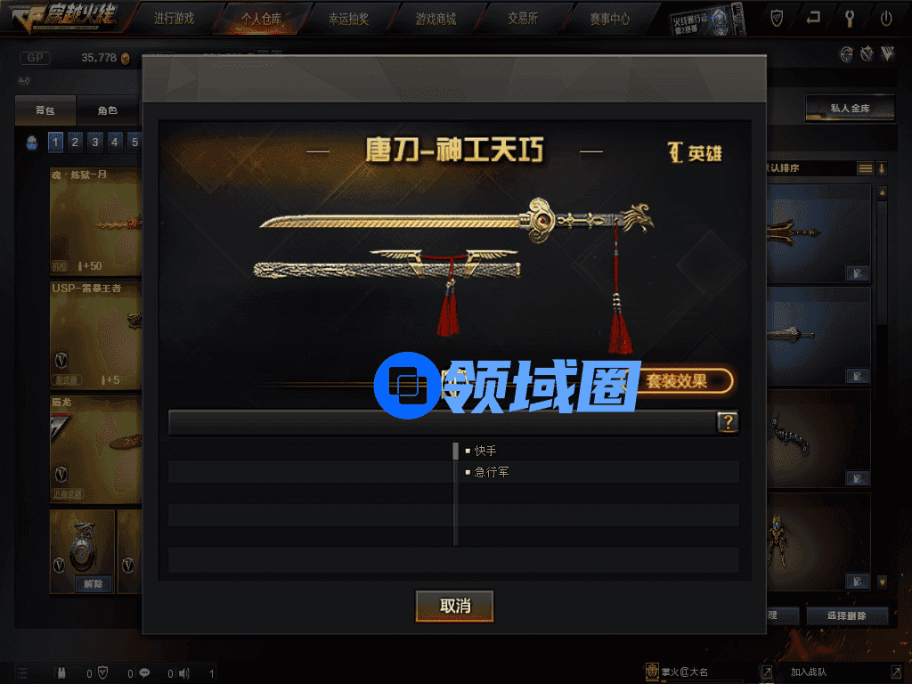 还有这款唐刀-神工天巧,虽然在属性面板里面只有快手和急行军这两个属性,但实际上还有一隐藏挑战属性。装备唐刀-神工天巧后可在挑战模式中右下角看见能量条,效果类似唐刀系列中的九五至尊和戎马一生。