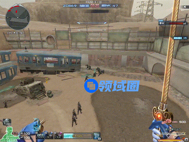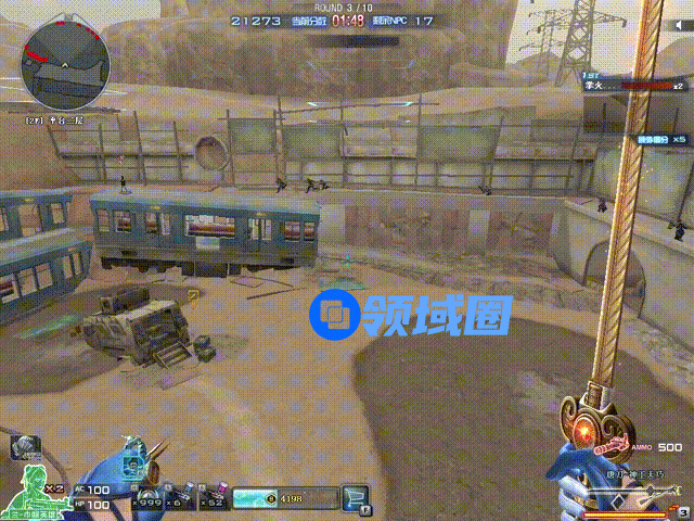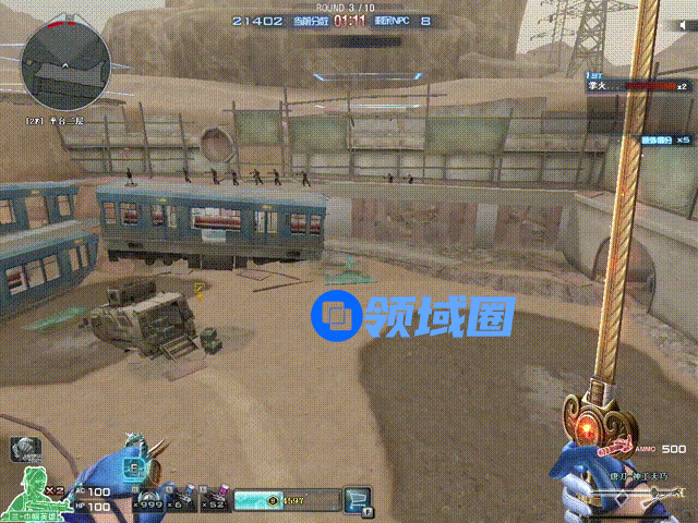 效果如上图所示,当右下角的能量条经过30秒充满后,按3号键可以向前释放剑气攻击,有绿色、蓝色和红色这三种随机颜色的剑气。