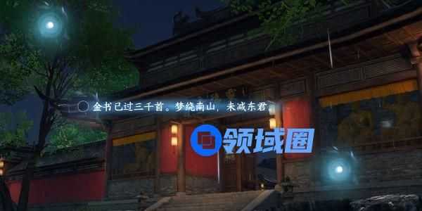 2、进入作词界面视野来到灵隐寺外可以看见灵隐寺的牌匾,点击中间光点以书院为意象写*句词(金书已过三千首。梦绕南山,未减东君。)。