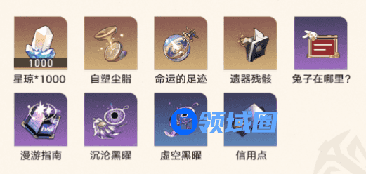 活动奖励:星琼*1000、自塑尘脂、命运的足迹、遗器残骸、兔子在哪里、漫游指南、沉沦黑曜、虚空黑曜、信用点。
