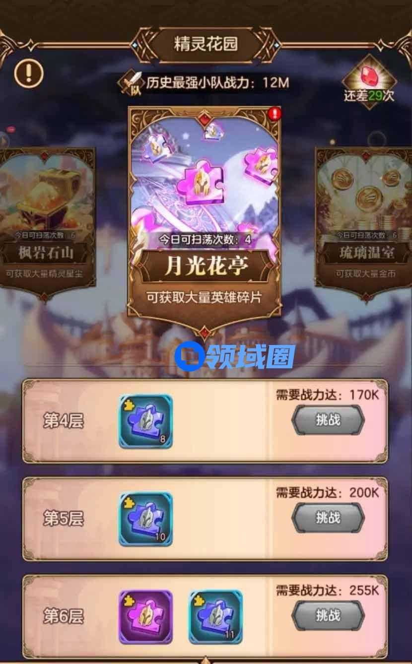 神域之路可以理解为各个阵营的试炼,玩法上属于爬塔玩法,只有神域之塔对上阵影响的阵营和挑战时间没有要求,其他塔都有相对应的要求。只要通过这些试炼就可以轻松获得钻石和英雄碎片和英雄经验道具。相对比神域之路的产出而言,精灵花园的产出则具有针对性,琉璃温室产出金币,藤蔓瀑布产出经验(主队),枫岩石山产出经验(英雄)、月光花亭产出英雄碎片,这些玩法全天开启,只要战力达标就可以进行挑战,但是每天每个副本只能扫荡六次。
