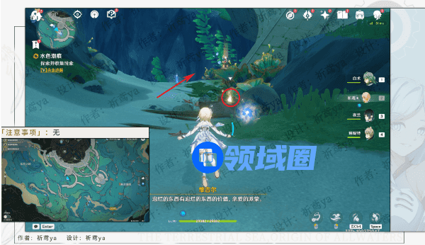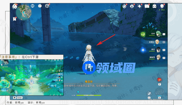 2、之后玩家跟着指引来到水下进行探索,前往下图标记位置,调查发光点;