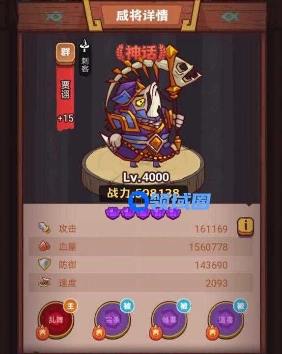 贾诩:神话品质的咸将,是刺客型,提升自己的攻击力与生命值,还会降低敌人的各方面属性,十分的棘手。