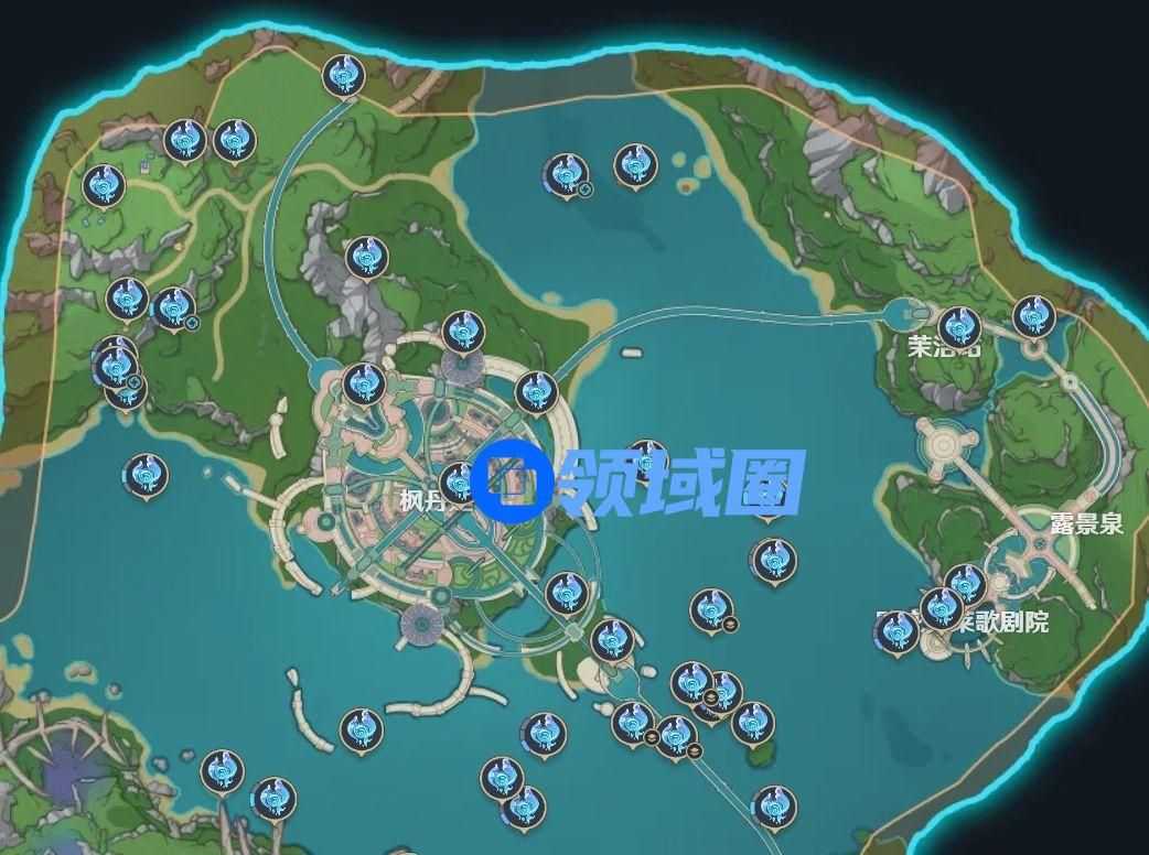 5.具体看上面图片点位就可以全部找到所有的水神瞳了,找齐了这些水神瞳之后,就可以去露景泉去供奉获得奖励了,奖励机制可以参考须弥的梦之树;