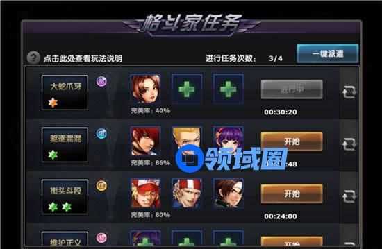2、每天只能完成4次任务,把属性好的格斗家优先一起完成一个任务,再接着完成下一个新人物,不要一下子4个任务一起进行,属性不好的格斗家会造成完美率过低,影响任务完成时间和奖励;