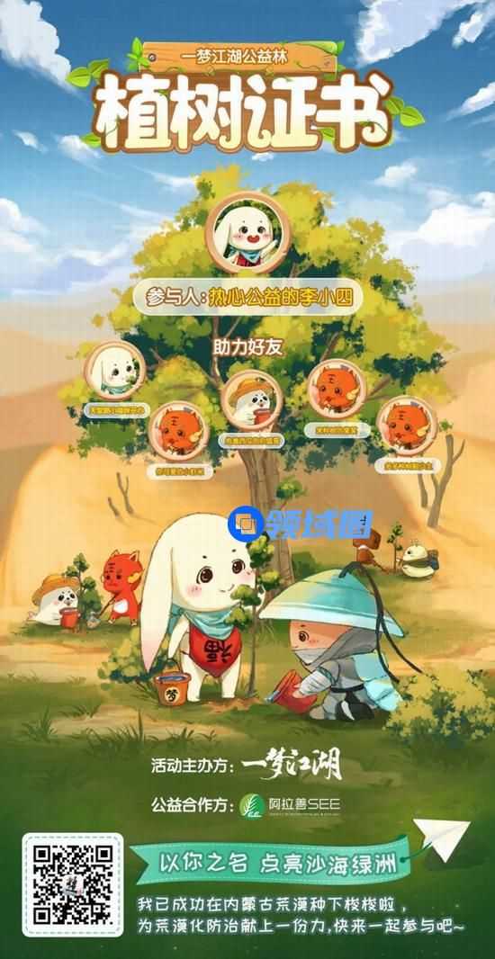在消夏节之际,少侠可以点击游戏中的“沙海绿洲”入口进入活动页面生成专属H5植树页面,只需邀请5位好友进行组队,即可完成对北京市企业家环保基金会“一亿棵梭梭”项目的支持,为荒漠地区种下梭梭。组队满员后,少侠可获得精美纪念卡证书以及自带纪念画册的宅邸植物“胡杨树”。